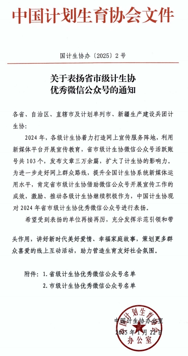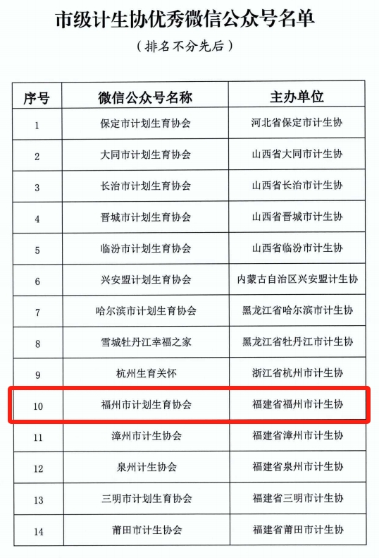 近日,中国计生协办公室下发《关于表扬省市级计生协优秀微信公众号的通知》(下称“《通知》”),充分肯定了2024年全年各级计生协着力打造网上宣传服务阵地、利用新媒体平台开展宣传教育的工作成效,并对省市级优秀微信公众号进行表扬。其中,“福州市计划生育协会”微信公众号被评为市级计生协优秀微信公众号。